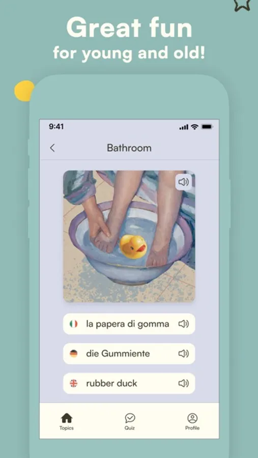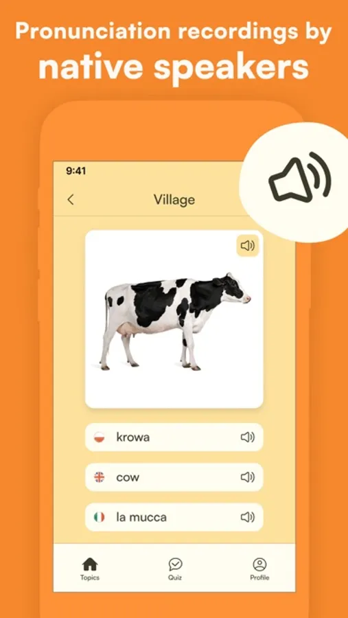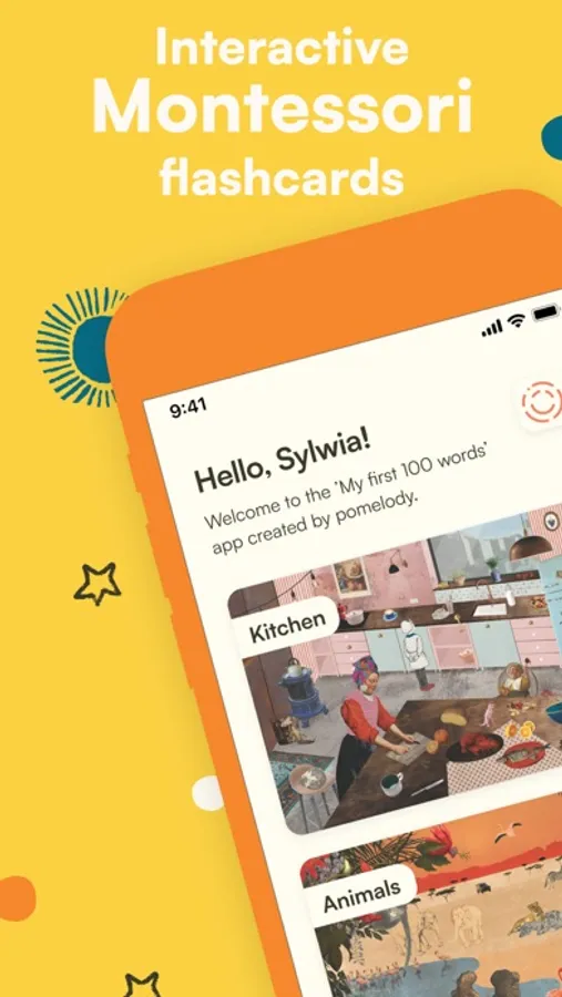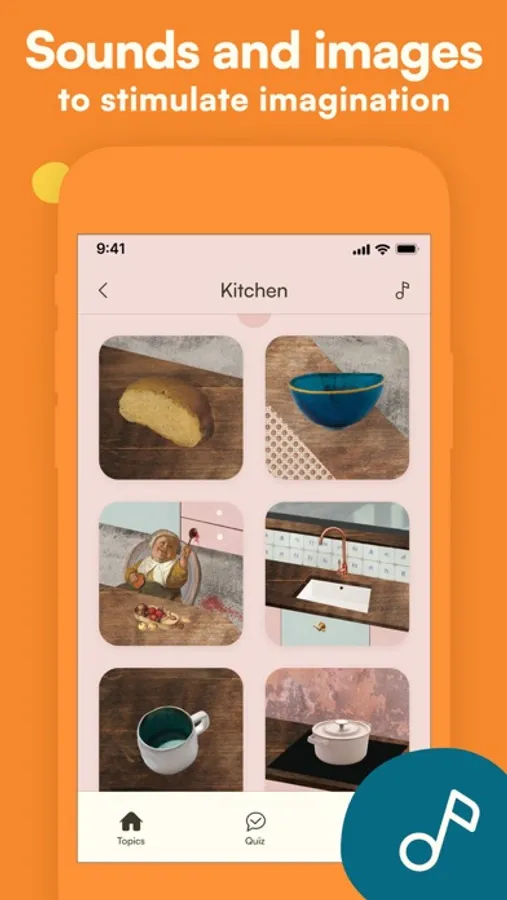Each word is accompanied by: a beautiful illustration, a real photo, sound and a pronunciation recording by a native speaker. Words are grouped into 10 categories, presented in artistic collages, to which we have added soundscapes.