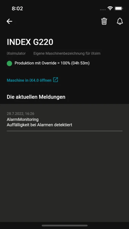 In der iXmobile App können Sie Ihre Maschinen einfach hinzufügen und jederzeit den aktuellen Produktionsstatus einsehen. Sie erhalten Benachrichtigungen beim Stopp der Produktion oder sich andeutenden Problemen. Dadurch können kostenintensive Stillstände insbesondere im bedienerarmen oder bedienerfreien Betrieb schnell erkannt und verhindert werden.