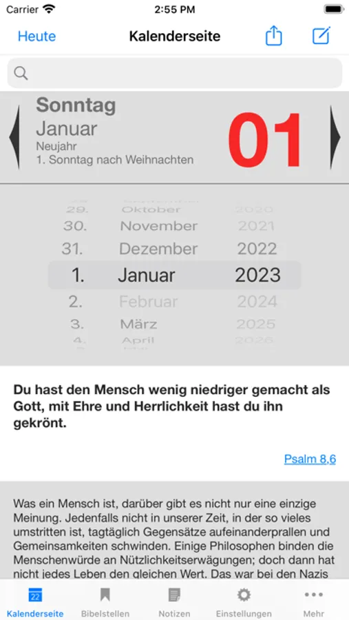 - Heute-Ansicht mit Datum, Wochentag, Bibelvers, Auslegung