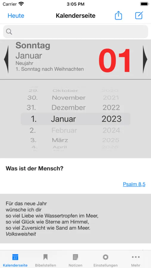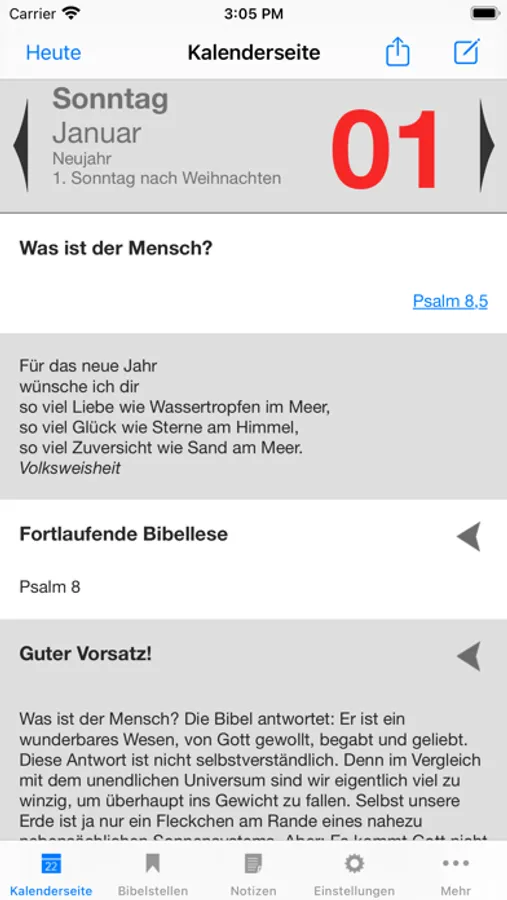 - Heute-Ansicht mit Datum, Wochentag, Bibelvers, Auslegung