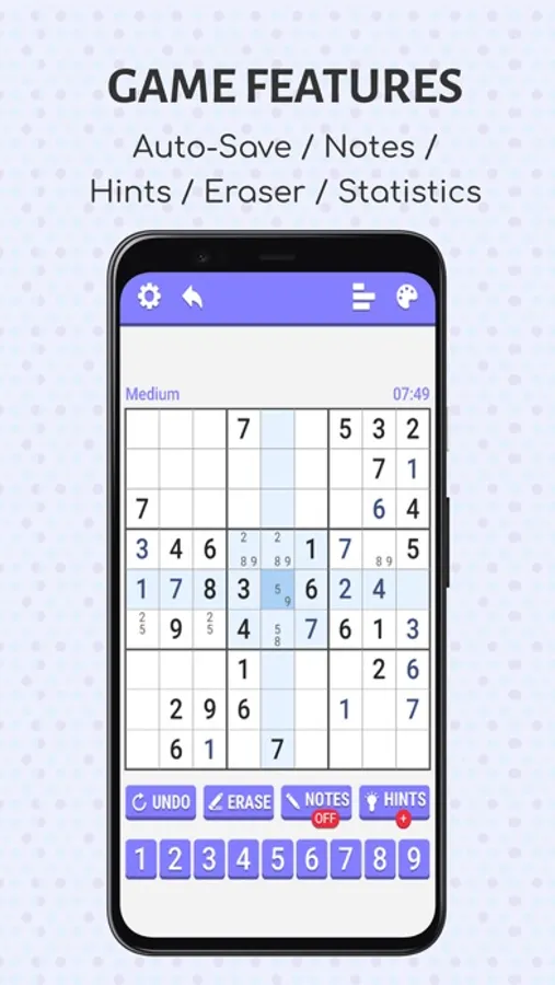 ◆ Notes → Turn on notes option to take notes just like you would on paper. Each time you fill in a cell on sudoku puzzle grid, notes are automatically updated!