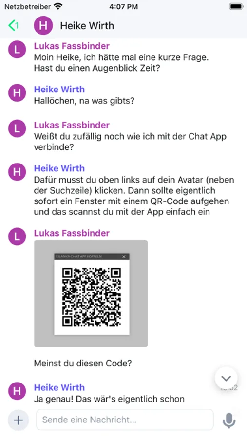 Kilanka Chat ermöglicht Ihnen datenschutzkonforme, unternehmensinterne Kommunikation mit Ihren Kollegen. Verschicken Sie Text-, Bild- oder Sprachnachrichten an einzelne Personen oder Gruppen.
