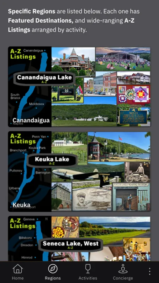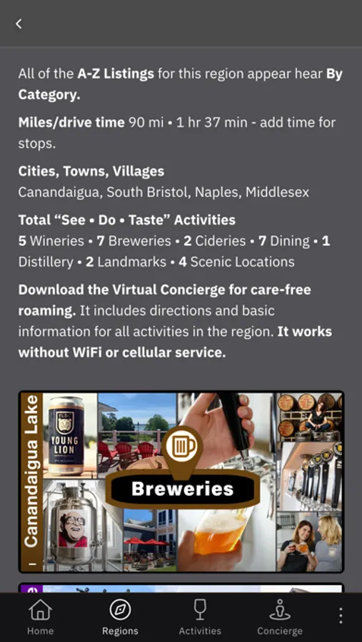 The Virtual Concierge Helps You Make Great Choices! From wineries and restaurants to hotels and entertainment activities, only the best destinations are vetted and presented as Featured Destinations on the main tour map. All other A-Z Listings appear in a side-stack on the downloaded collection.