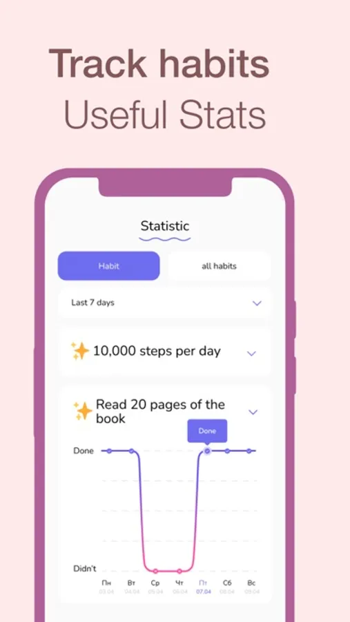 You plan a simple habit by entering it into the daily checklist. You can list anything you would like to develop or dump. It also works perfectly to fight procrastination.