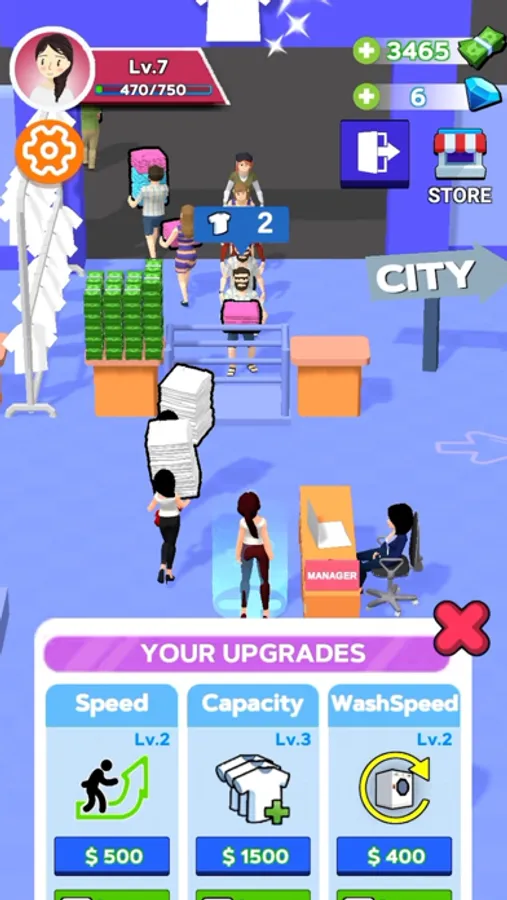 Indeed, don’t forget to improve your hero skills! Go to the manager desk to increase your speed and upgrade your hero to do the laundry faster. Also, upgrade the speed of the washing machines. Wash more clothes to earn more. Money will help to grow faster and build your own laundry empire.