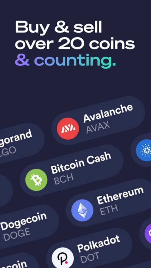 - Large selection of top digital currency in the market (and new coins added weekly!): Bitcoin (BTC), Ethereum (ETH), Litecoin (LTC), Dogecoin (DOGE), Polygon (MATIC), Aave (AAVE), Bitcoin Cash (BCH), Stellar (XLM), Polkadot (DOT), Cardano (ADA), Chainlink (LINK), Basic Attention Token (BAT), Solana (SOL), Algorand (ALGO), Fantom (FTM), USD Coin (USDC), Dai (DAI), Shiba Inu (SHIB), Tezos (XTZ) and Tether (USDT).