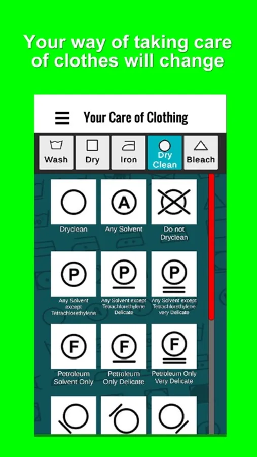 Your Care of Clothing, is the application that, with a modern design, groups symbols into various categories that explain how to take good care of your garment.