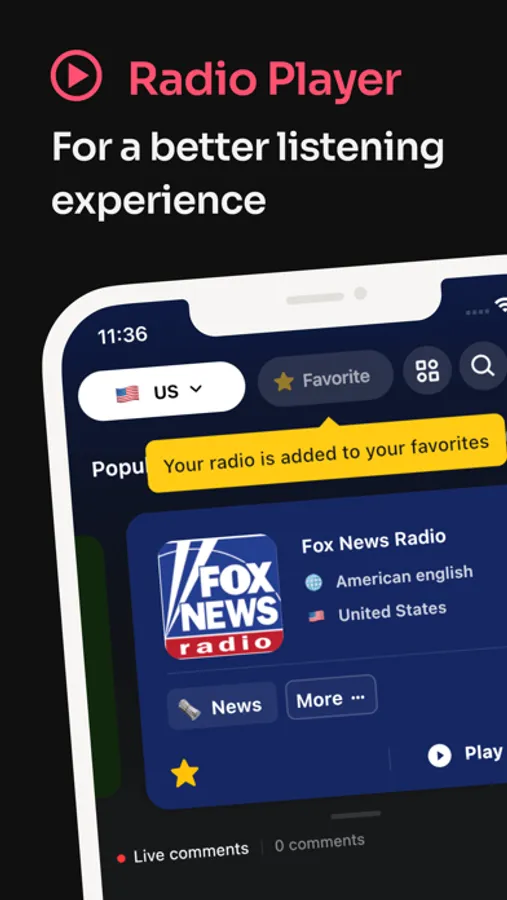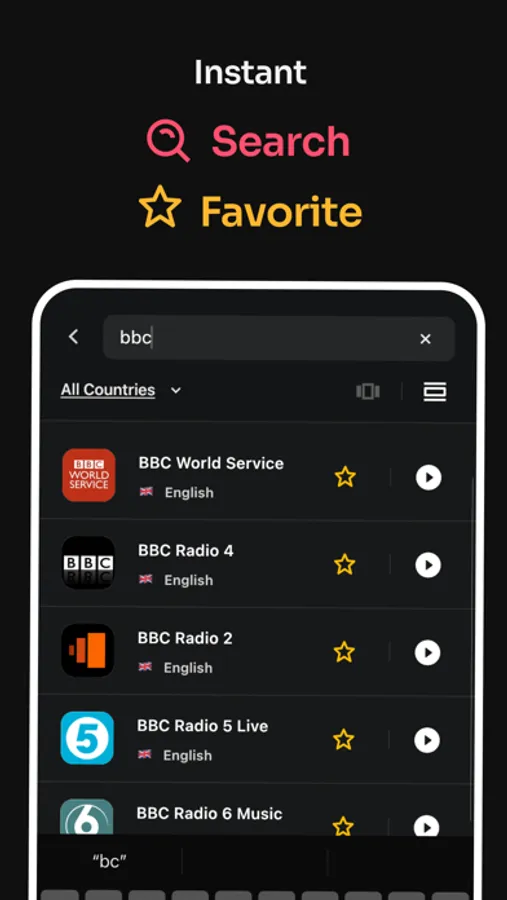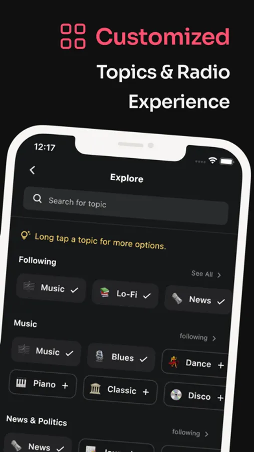 * Search any radio, topic, music, news, and more to discover the most popular and worldwide stations waiting for you.