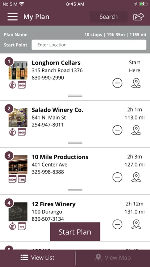• Create your own custom itinerary by adding Texas wineries, businesses, and tours to your own custom plan