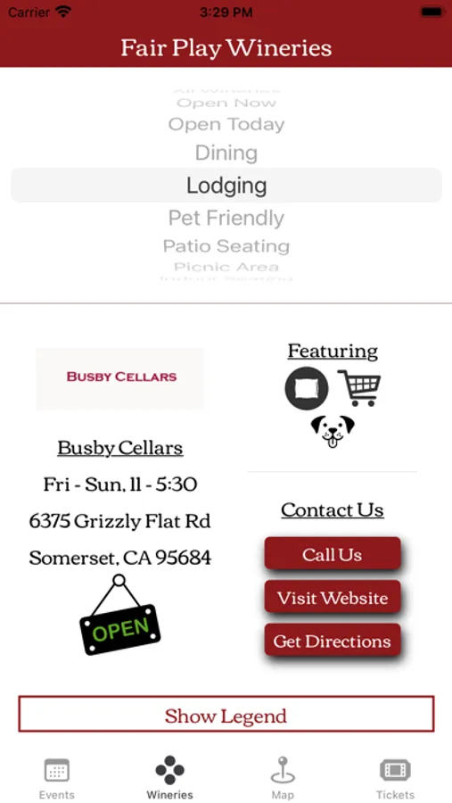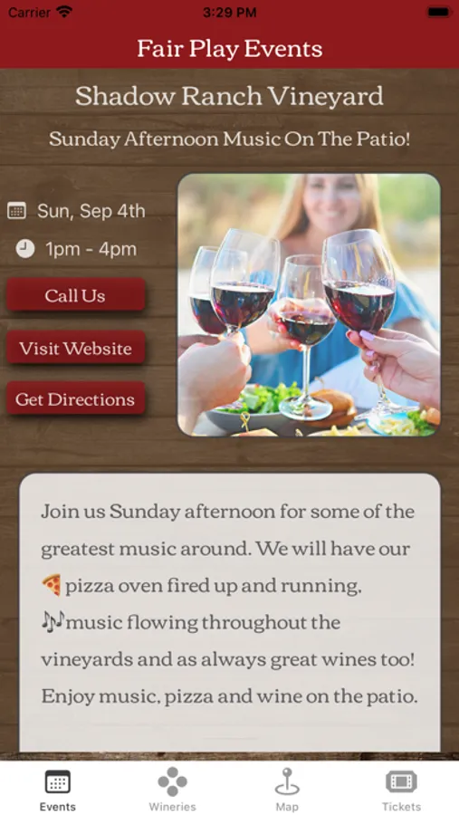 The Fair Play Wineries App provides monthly updated events with optional push notifications to get the first notice of new tickets/events. Events are chronological and offer direct links to buy tickets. Wineries can be filtered to show a specific feature. Winery Features include the following categories: All Wineries, Open Now, Open Today, Dining, Lodging, Pet Friendly, Patio Seating, Picnic Area, Indoor Seating, Hiking Trails, Online Wine Sales, Private Tastings, & Wedding Venues.