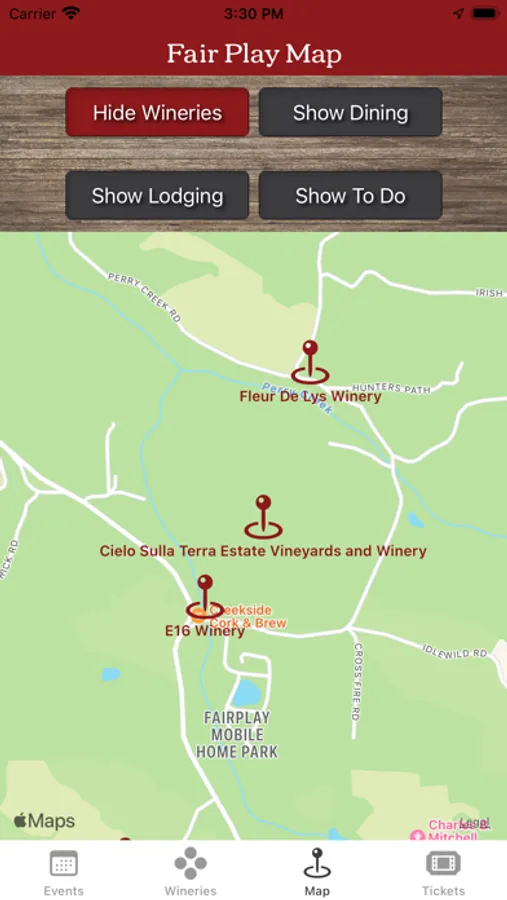 Also included is a map with markers to show/hide all wineries, lodging options, dining options, and to-do options to accompany FairPlayWine.com. Tapping on markers allows for Apple Maps directions from the patron's location.