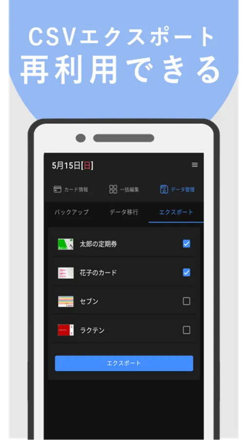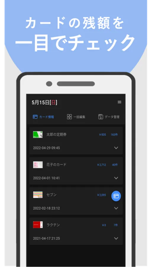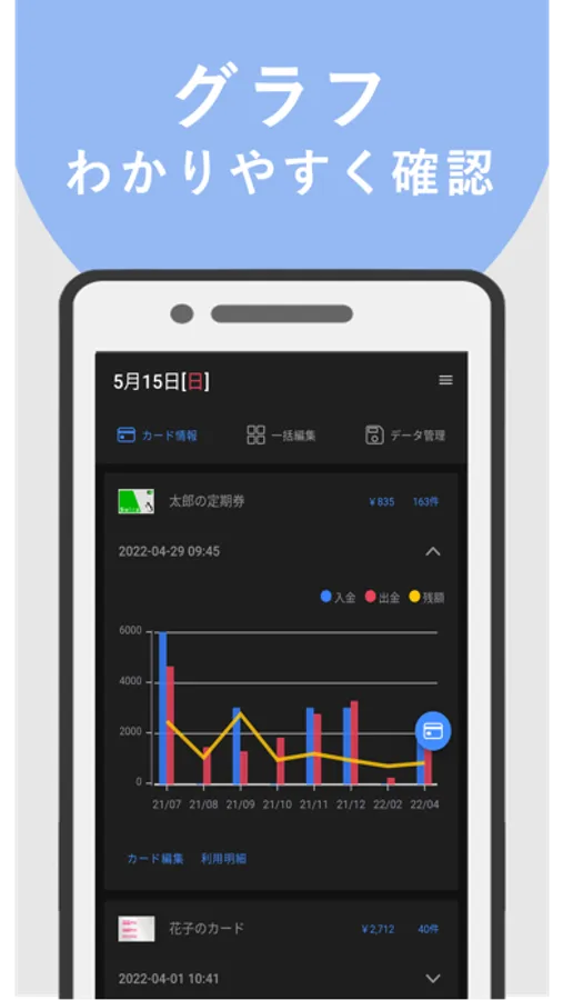 ・カードをかざすだけで、利用履歴を取り込んでスマホに保存します。