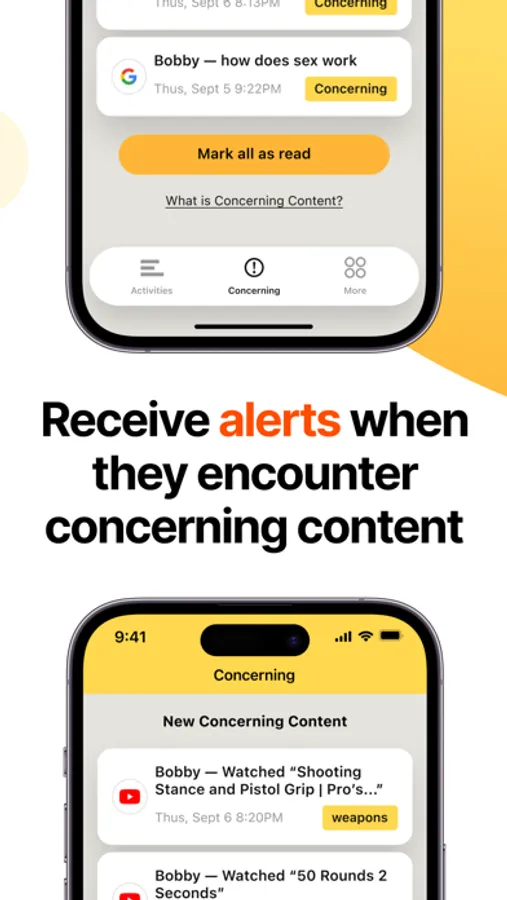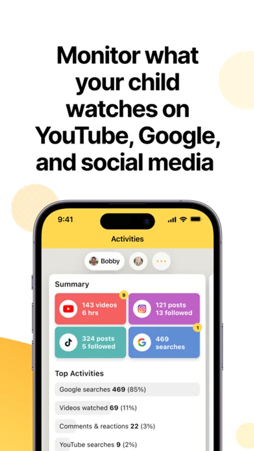 BrightCanary empowers you to guide and protect your kids when they're using YouTube, Google, TikTok, and Instagram by: 1) alerting you when your kids are watching inappropriate content; 2) providing insights into their digital behavior; and 3) giving tailored advice on how to talk to your kids about difficult topics they encounter.