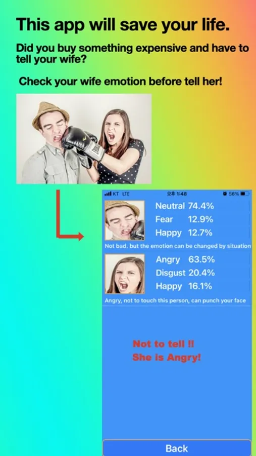 1. This app will save your life! Did you buy something expensive and have to tell your wife? Check your wife emotion before tell her!