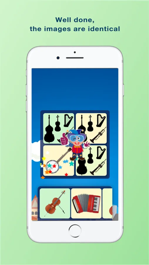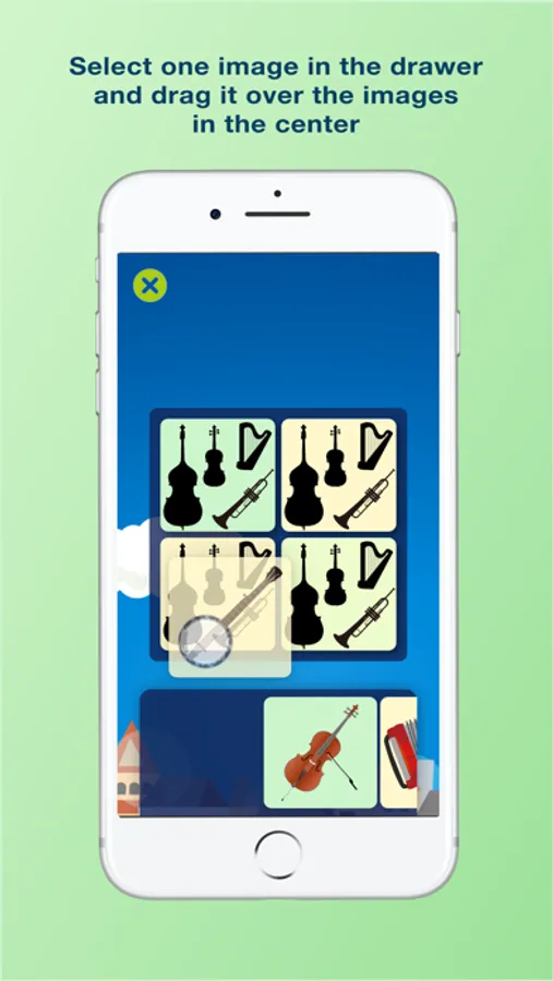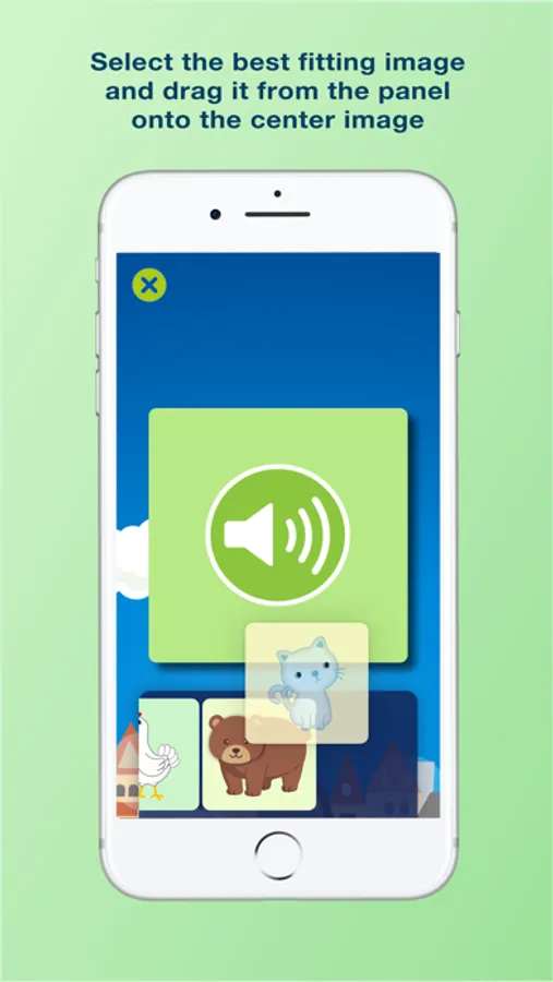 Finding identical images works in a similar fashion, but instead of having one image in the center of the screen, all four images appear for a short while and are then hidden. Select the image in the drawer that is identical to the main image and drag it from the panel over the main image. If the combination is correct, visual feedback will be displayed and the pronunciation of the word will start.