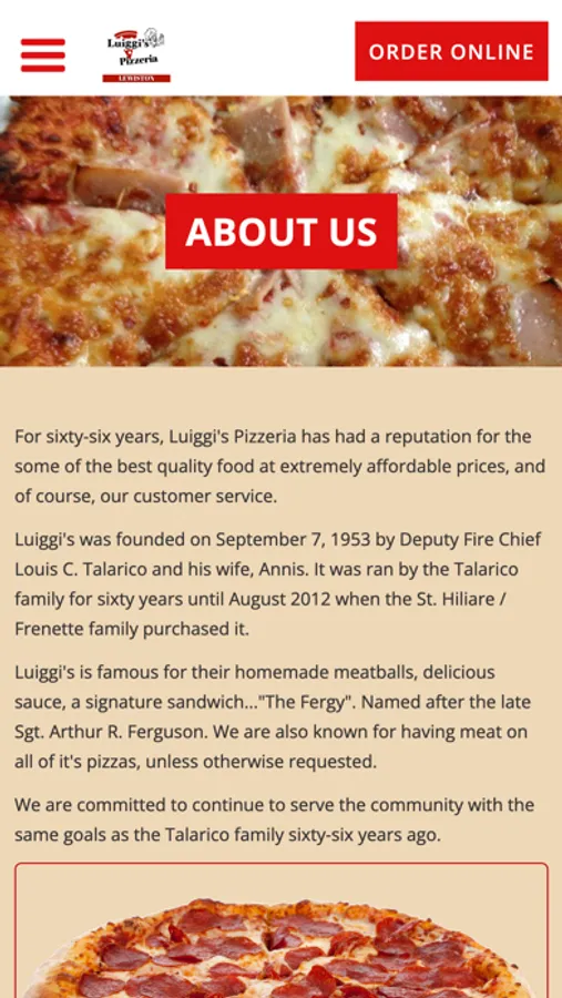 Luiggi's was founded on September 7, 1953 by Deputy Fire Chief Louis C. Talarico and his wife, Annis. It was ran by the Talarico family for sixty years until August 2012 when the St. Hiliare / Frenette family purchased it.