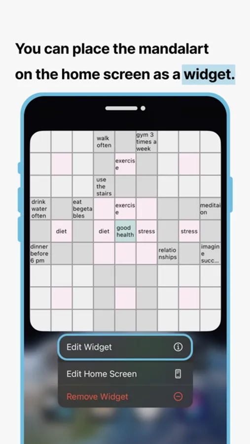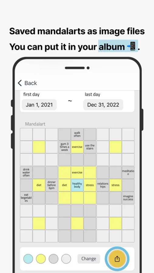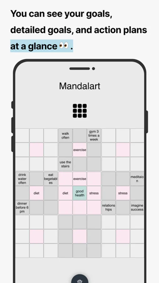 The mandalart has two functions. The first feature is the ability to organize or refine ideas around keywords. The second function is to help you achieve your goals. This app is focused on the second function and may not be suitable for those who are intended for the first function.