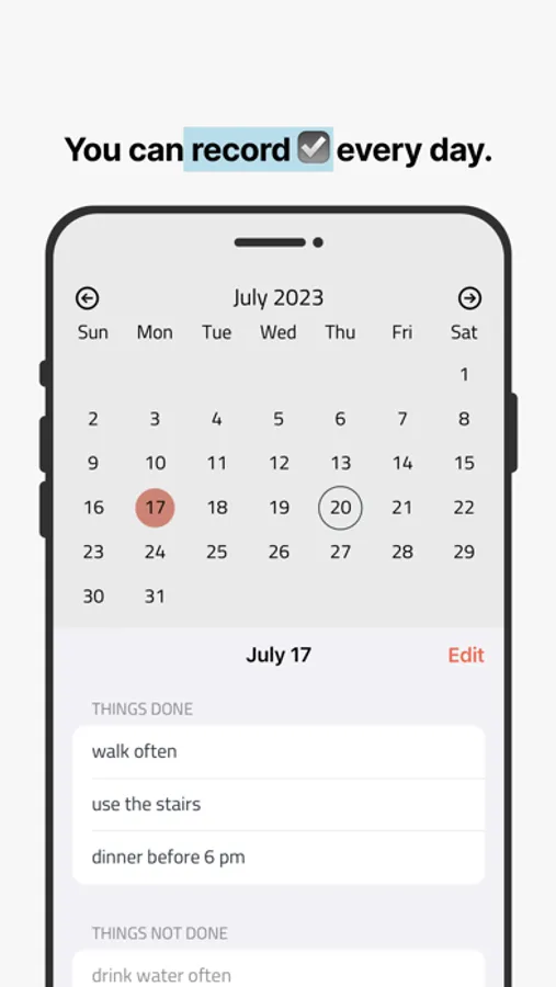 If you touch the date on the calendar inside the app, you can check what you did that day with the checklist you set and record what you want to record.