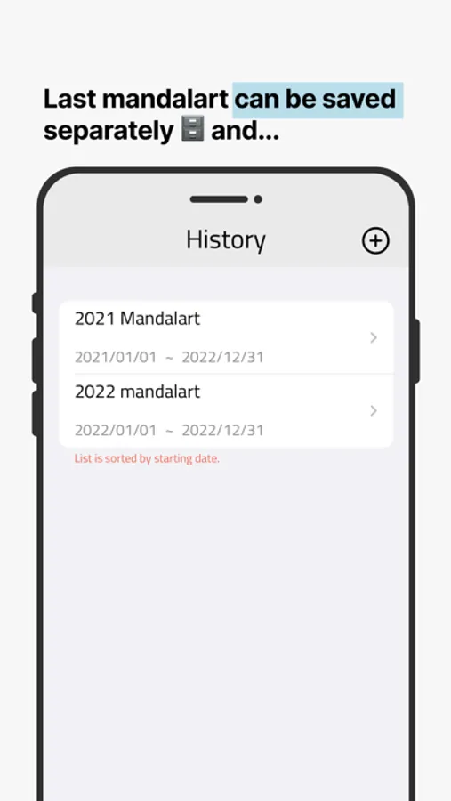 As mentioned earlier, there is only one mandalart at a time. In order to start a new journey by setting a new key goal, you need to delete the old mandalart. There was a user's opinion that it would be a pity to simply delete it, so we made it so that the existing mandalart can be saved. On the screen called History, you can save the existing mandalart and record your impressions so that you can look back on your past journey.