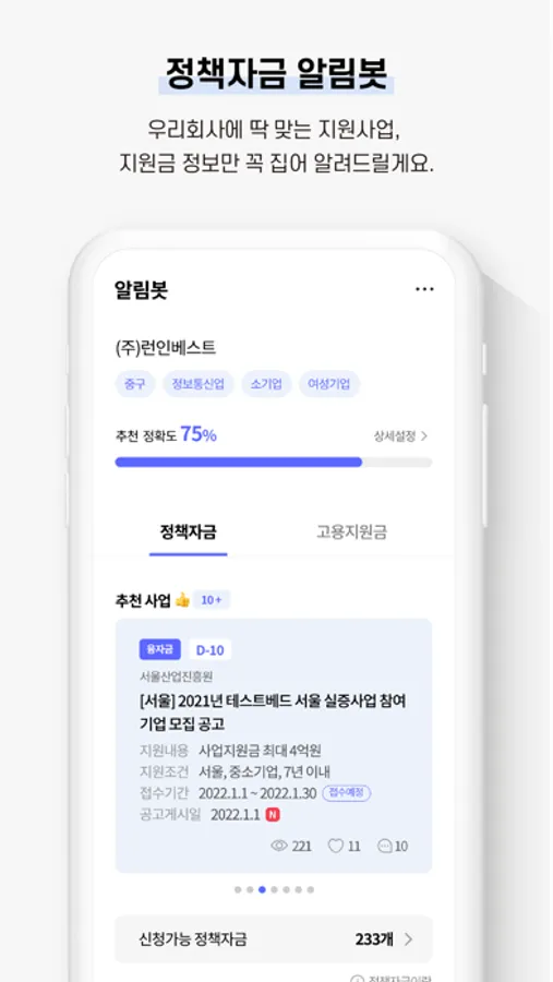 · 우리 회사에 딱 맞는 지원 사업, 지원금 정보만 꼭 집어 추천해 드려요.
