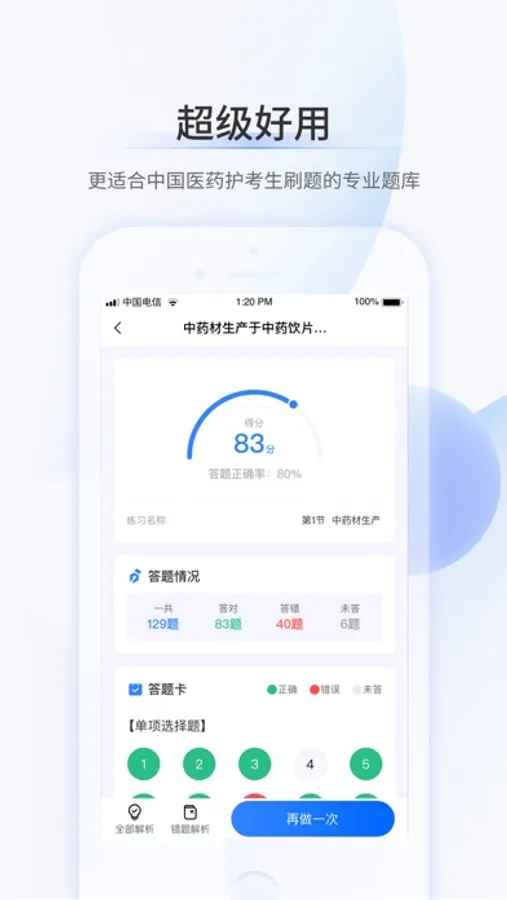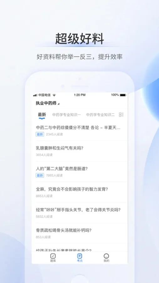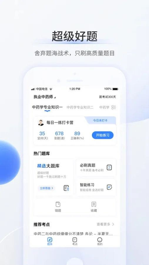超级题库App是一款针对药学考试的在线题库软件,总结多年产品研发打磨经验,把握大纲规律和命题方向,旨在为医药护考生提供便捷高效的刷题工具。超级题库新版本上线后,有题库和考点两大核心模块功能,题库功能多场景多元素化。其中,题库模块提供每日一练、精选大题库、必刷真题、模拟考试、等特色功能,收录多年考试历史真题、模拟题等,含有题库及解析,支持离线下载,可收藏题目、记录错题,节省时间和脑容量,摒弃冗长的课本。此外,APP还为用户提供干货资料,随时随地在线查看,还能通过下载电子版功能进行打印,满足不同用户的学习习惯,为用户提供充足精炼的备考知识,节省时间学习备战药学考试。