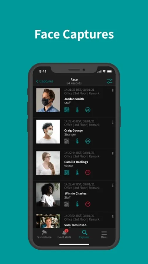 • Face Captures: With our advanced facial recognition technology, you can securely monitor and manage access in prespecified areas.