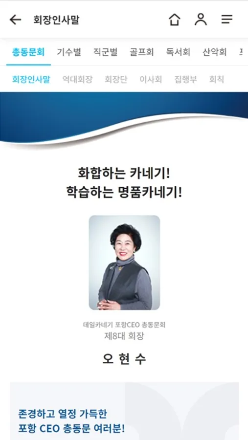 -총동문회 인사말/역대회장/회장단/이사회/집행부/회칙