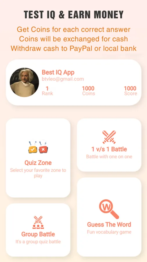 - Each correct answer gets 10-30 Coins. 1000 Coins exchange to 5 USD. Withdraw cash to your local bank or PayPal account.