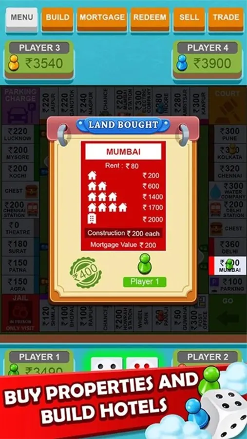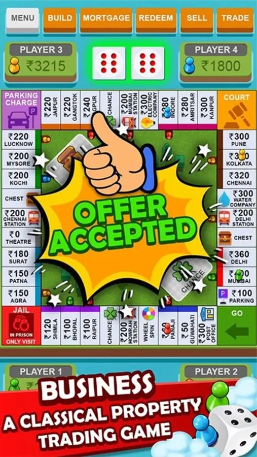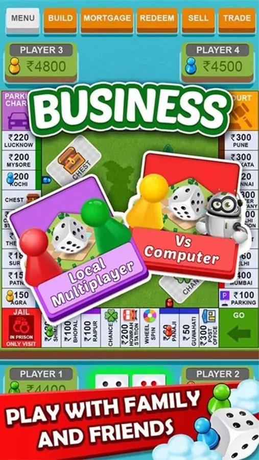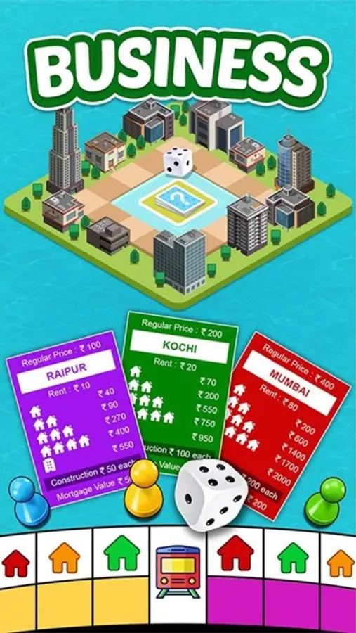 Vyapari : Business Dice Game is free turn based economic strategy game that allows you to buy business properties, build levels, collect rent, rob bank and so much more. The main objective is simple - bankrupt opponents, The key to be rich is to buy properties of the same color to create house , hotel and build more levels to increase rent.