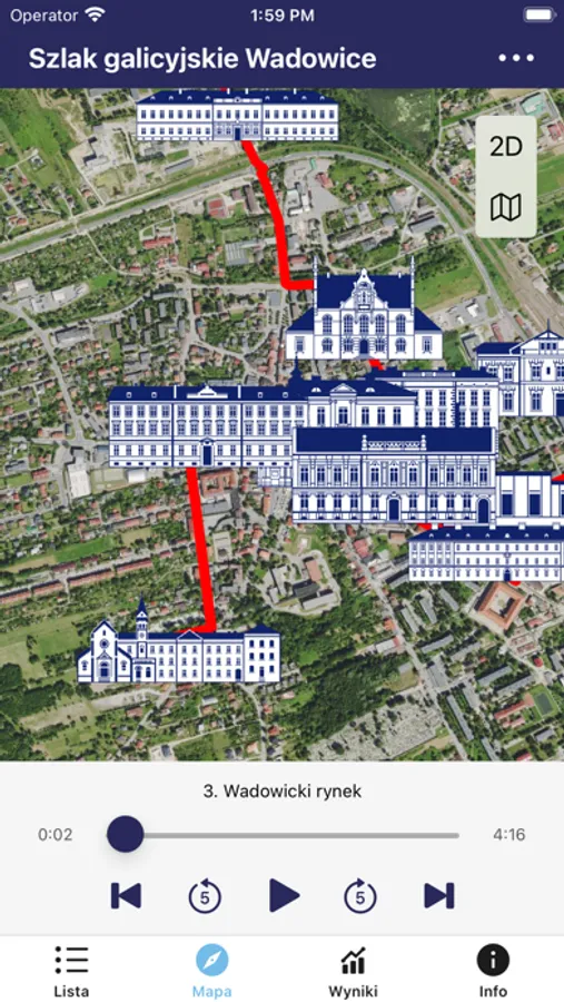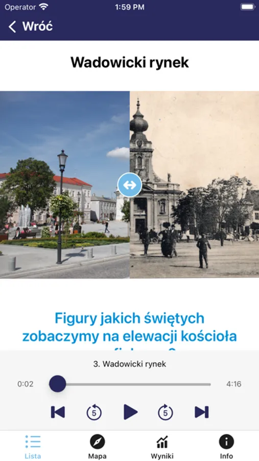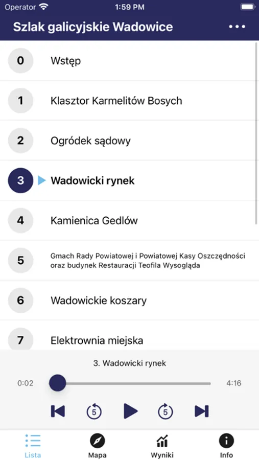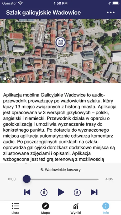 Aplikacja mobilna Galicyjskie Wadowice to audio-przewodnik prowadzący po wadowickim szlaku, który łączy 13 miejsc związanych z historią miasta. Aplikacja jest opracowana w 3 wersjach językowych – polski, angielski i niemiecki. Przewodnik działa w oparciu o geolokalizację i umożliwia wyznaczenie trasy do konkretnego punktu. Po dotarciu do wyznaczonego miejsca aplikacja automatycznie odtwarza komentarz audio. Po poszczególnych punktach na szlaku oprowadza galicyjski dorożkarz dodatkowo miejsca są zilustrowane zdjęciami i opisami. Aplikacja wzbogacona jest też grą terenową z możliwością grywalizacji.