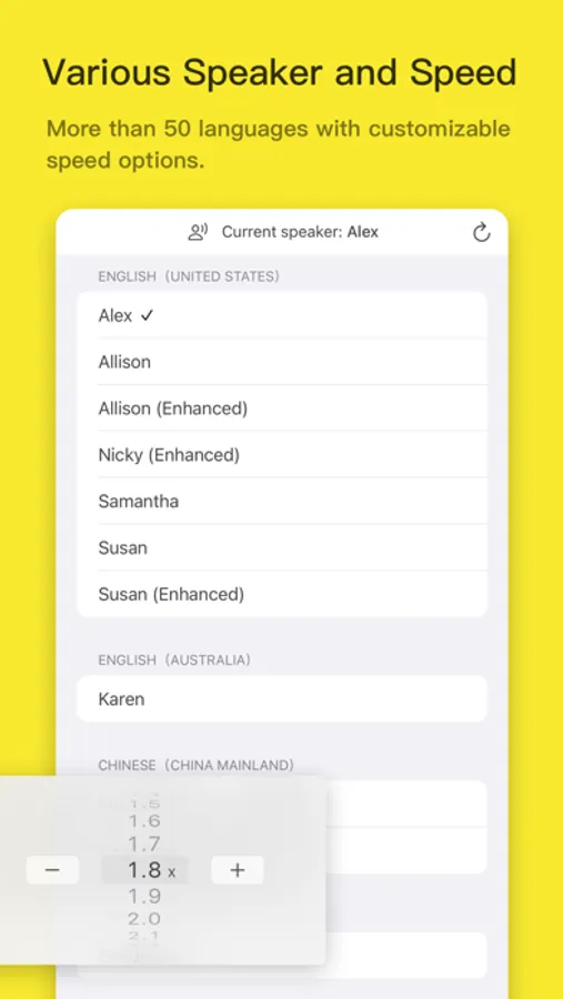- Multi-language text-to-speech: supports voice playback for major international languages with various voices to choose from.