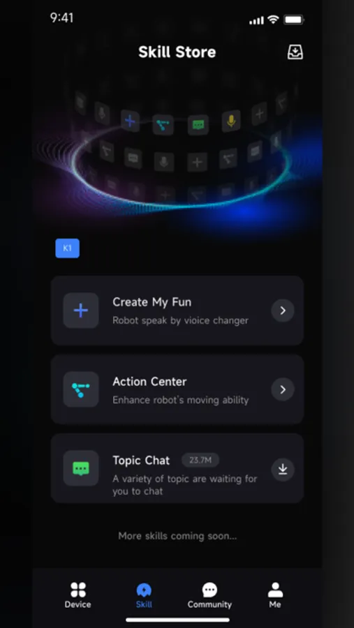 The Skill Store is like an app store for Robosen robots, generating massive amounts of entertainment content. You can explore Skill Store and experience infinite gameplay possibilities by downloading various skills developed by global creators& developers, such as Create My Fun, Action Center, Open Chat, etc., Share your brilliant ideas with the community or download other players' inspirational creations with just one click.