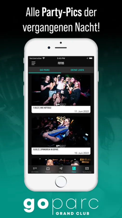 Du erfährst als erster, wann die nächste Party steigt und profitierst dabei noch von fetten Aktionen. Zum Event sparst du mit unseren Gutscheinen bares Geld. Damit du dich am Tag danach auch an den geilen Abend erinnern kannst, stellen wir alle Party-Pics in der App bereit.