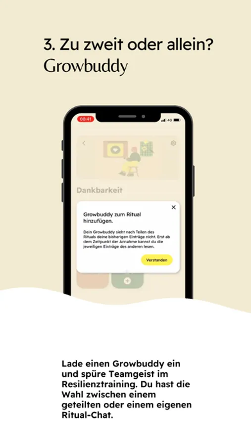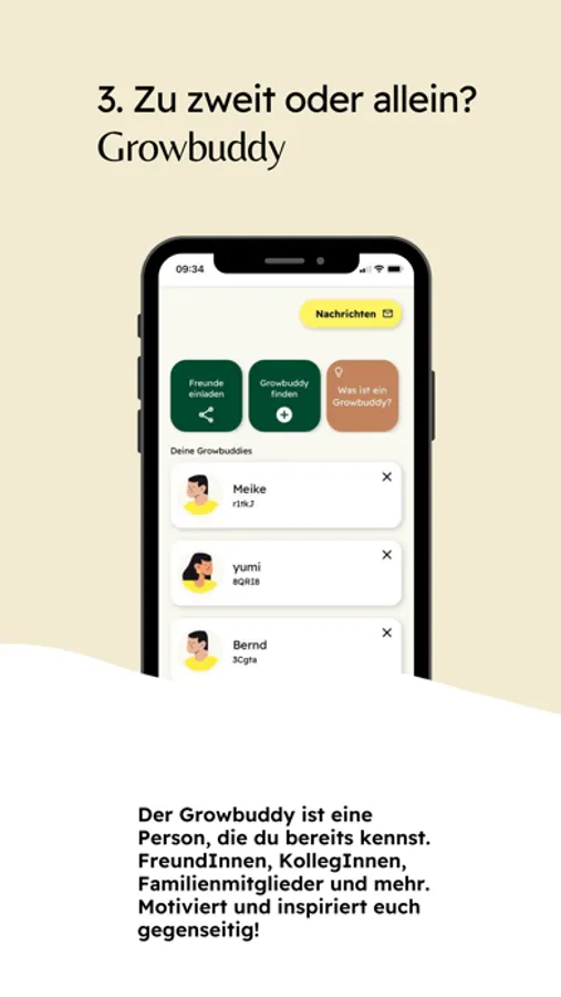 Die Besonderheit: Einzigartiger Teamgeist! Stelle dich der Herausforderung nicht alleine. Wähle den Growbuddy-Modus, um zusammen mit Gleichgesinnten mentale Stärke zu gewinnen.