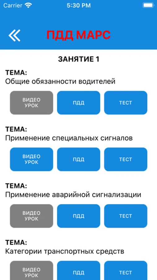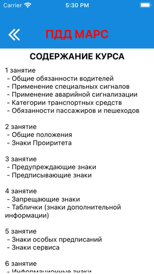 Все темы ПДД разложены на 13 занятий. В каждом занятии по каждой теме есть видеоурок, конспект, и официальный текст ПДД с картинками.