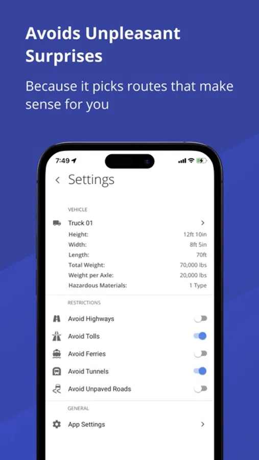 It’s the app professional commercial drivers like you trust because it plans routes for your vehicle - height, weight, axles, hazardous restrictions, and more!