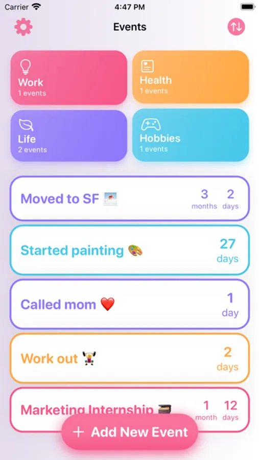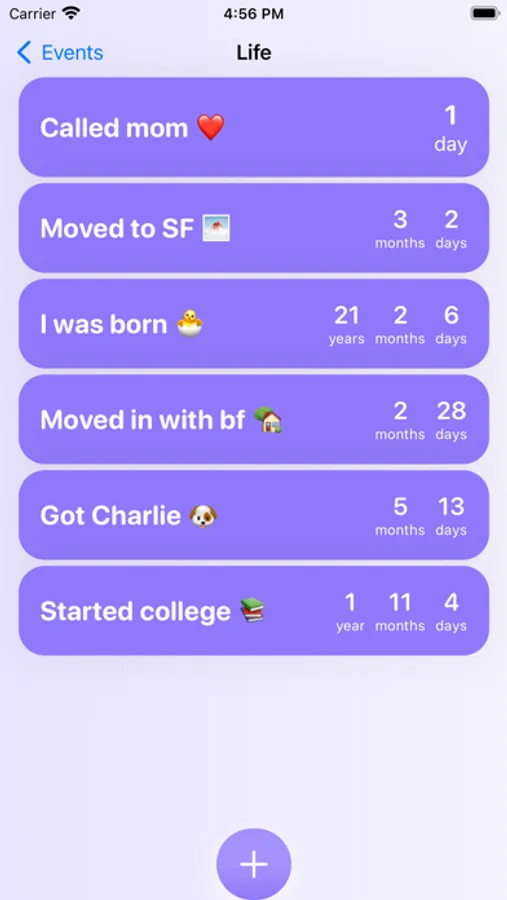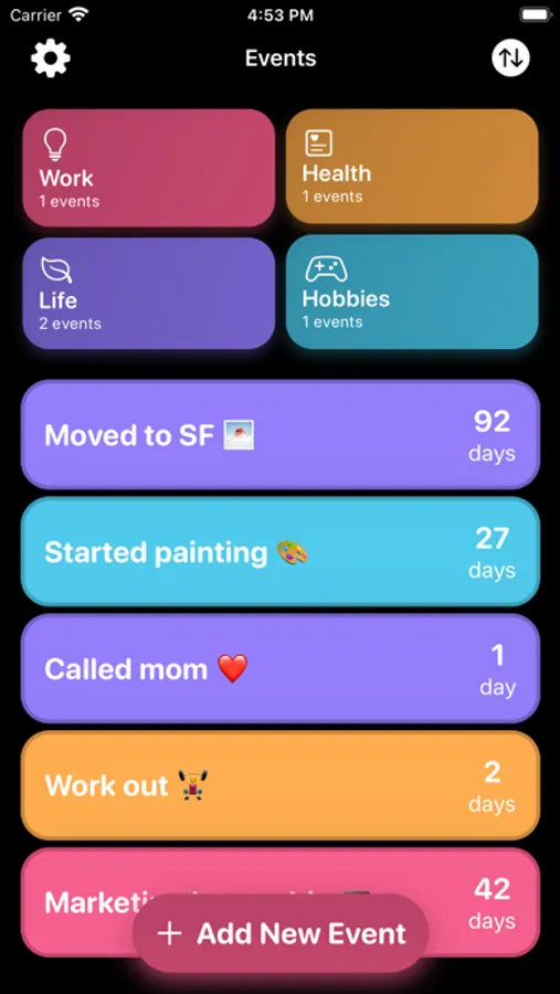 - Unlimited event cards to count the days since you last did something.