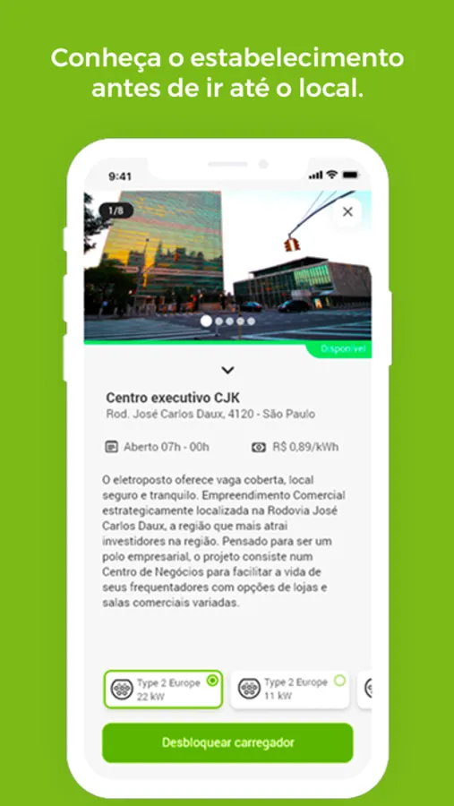 Otimize seu tempo: encontre um eletroposto, saiba seu estado de uso, desbloqueie o eletroposto e tenha controle sobre o andamento da sua recarga, tudo isto em tempo real e pelo aplicativo!
