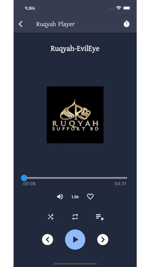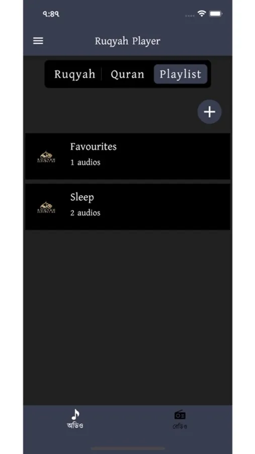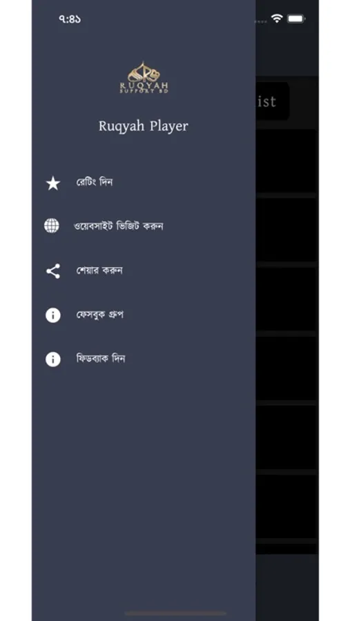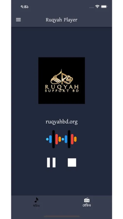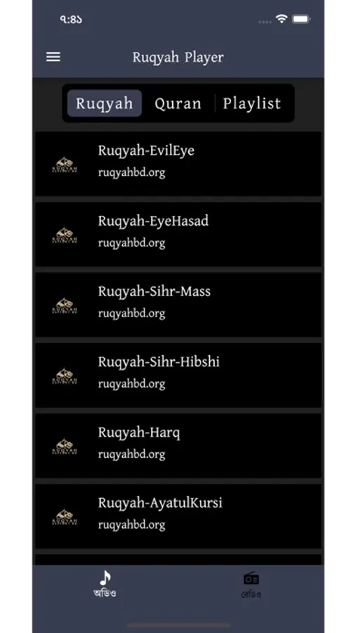 Here are all the necessary functions like audio player. If you have an internet connection, you can play Ruqyah audio or Quran recitation online. Recitation of the Qur'an first only with Arabic recitation followed by Bengali translation.