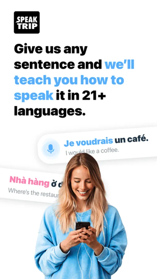 SpeakTrip is the only language learning app that listens to you speak, translates everything you say to your target language and uses advanced Artificial Intelligence to teach you how to speak it correctly.
