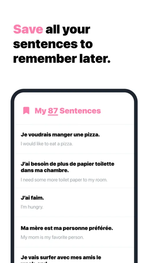 Learn and save new sentences in your own customized phrase book to use them on your next trip, on your next meeting at work or in any other situation you can think of.