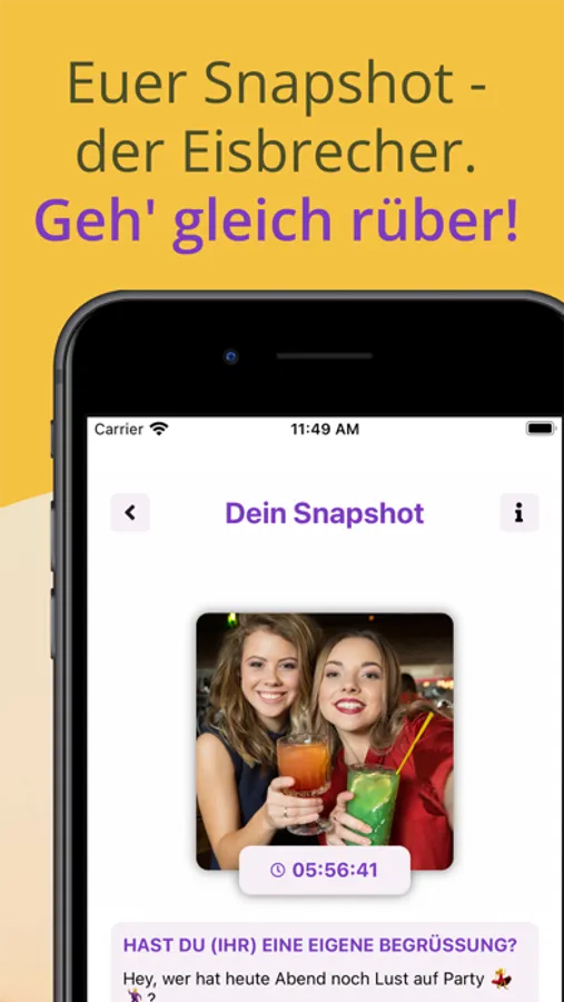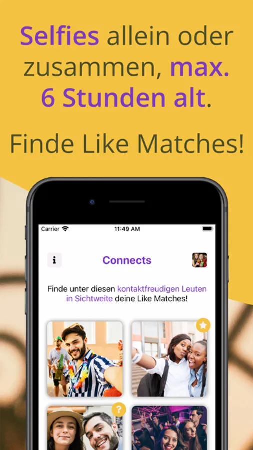- Alle Selfies sind garantiert echt und aktuell: Wir erlauben nur direkte Kameraaufnahmen und löschen sie automatisch nach 6 Stunden. So stellen wir sicher, dass ihr euch vor Ort auch erkennt! Du kannst dabei jederzeit auf dein Selfie tippen, um ein Neues hochzuladen.