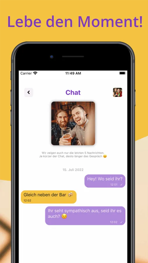 - Der Chat ist ab dann für 2 Stunden geöffnet. Denk‘ dran: Je kürzer der Chat, desto länger das Gespräch! Wenn du den Ort des Like Matches verlassen musstest, kannst du in der verbleibenden Zeit noch Kontakt halten und dich vielleicht später noch verabreden und treffen!