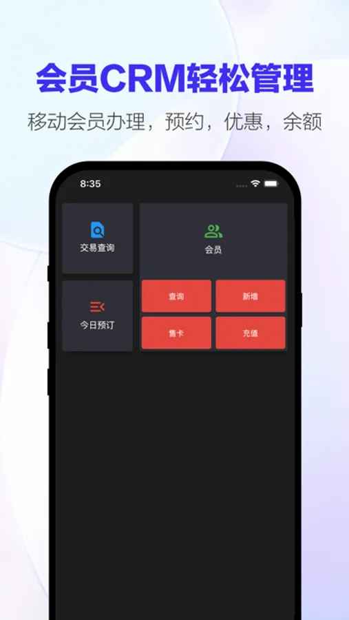 经营场所服务员可以通过手机端的移动POS完成卡包使用情况浏览;完成开台,点单,结账,赠送等服务员常用操作,