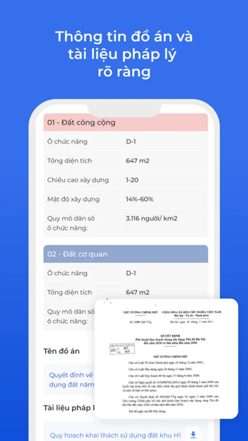 + Thông tin quy hoạch đầy đủ: của một vùng, thửa đất như Quy hoạch kế hoạch sử dụng đất, quy hoạch xây dựng và hiện trạng từng ô đất trên toàn quốc.