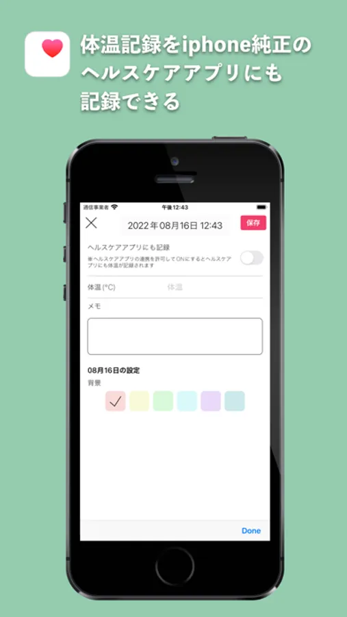 - 純正ヘルスケアアプリにも同時に体温を記録