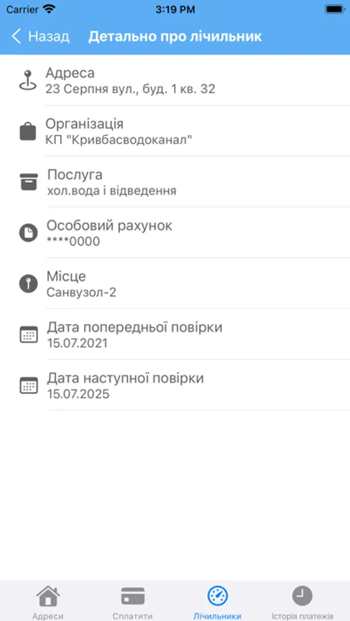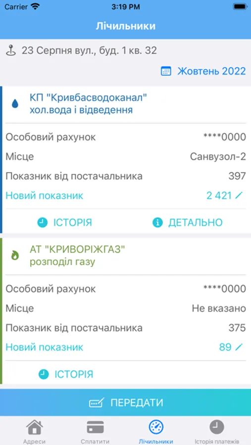 ๏ швидко та зручно передати по кожній послузі показники по кожному приладу обліку, а також відстежити їх історію.