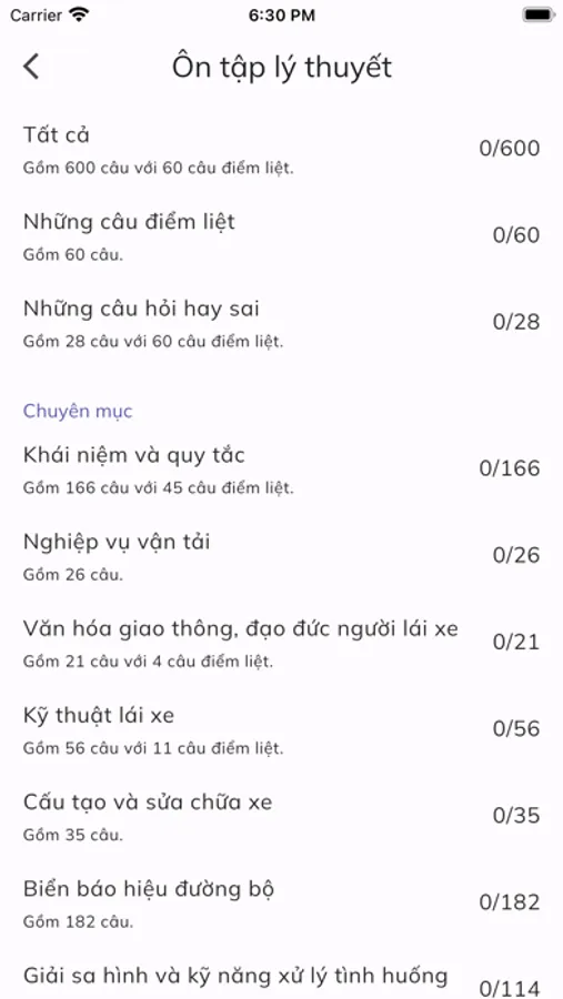 - Ôn tập tất cả 600 câu hoặc theo hạng bằng, câu điểm liệt, câu hay sai, theo các chương…