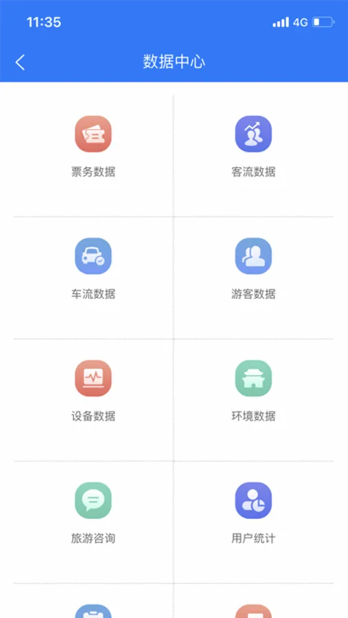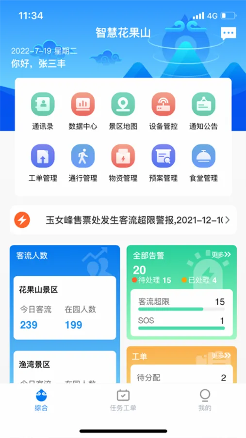 管理者在APP上通过数据中心、设备管控、通知公告、物资概念了、预案管理、食堂管理等功能管理整个景区;
