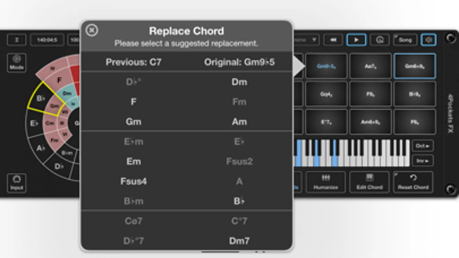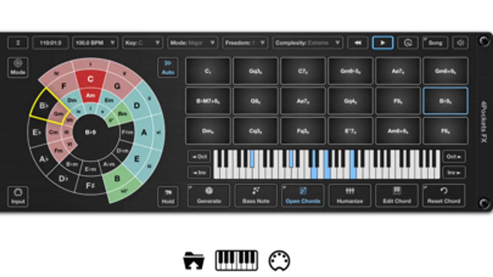 Progressions supports open and closed chords with selectable voicings. It has an intelligent algorithm that attempts to align top notes of chords, add additional bass, and open chord padding to give equal weight to chords with only 3 notes. You can even play with rootless voicings.